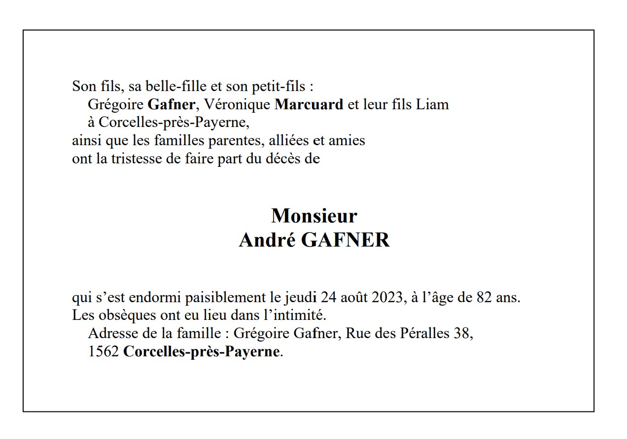 Monsieur André GAFNER 13 déc. 1940 - 24 aoû. 2023 Avis mortuaire PFG Télecharger PDF Partager sur: Galerie