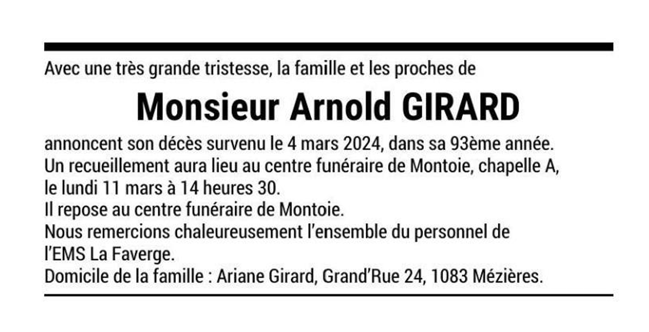 Monsieur Arnold GIRARD 17 juin. 1931 - 04 mar. 2024 Avis mortuaire PFG Télecharger PDF Partager sur: Galerie PreviousNext PreviousNext