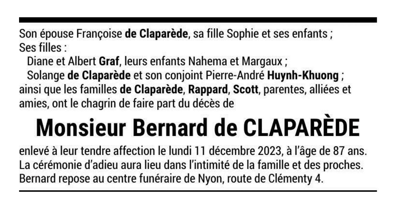 Monsieur Bernard de CLAPARÈDE 06 juin. 1936 - 11 déc. 2023 Avis mortuaire PFG Télecharger PDF Partager sur: Galerie PreviousNext PreviousNext