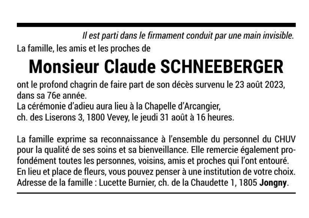 Monsieur Claude SCHNEEBERGER 16 nov. 1947 - 23 aoû. 2023 Avis mortuaire PFG Télecharger PDF Partager sur: Galerie PreviousNext PreviousNext