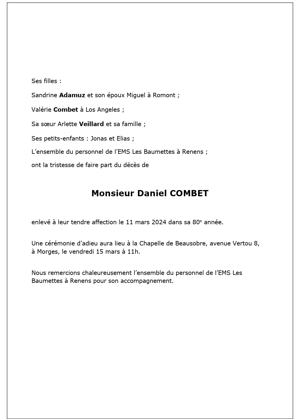 Monsieur Daniel COMBET 22 aoû. 1944 - 11 mar. 2024 Avis mortuaire PFG Télecharger PDF Partager sur: Galerie PreviousNext PreviousNext