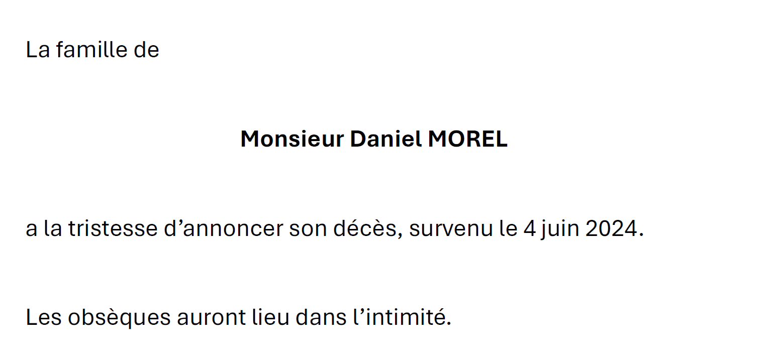 Monsieur Daniel MOREL 03 mar. 1956 - 04 juin. 2024 Avis mortuaire PFG Télecharger PDF Partager sur: Galerie
