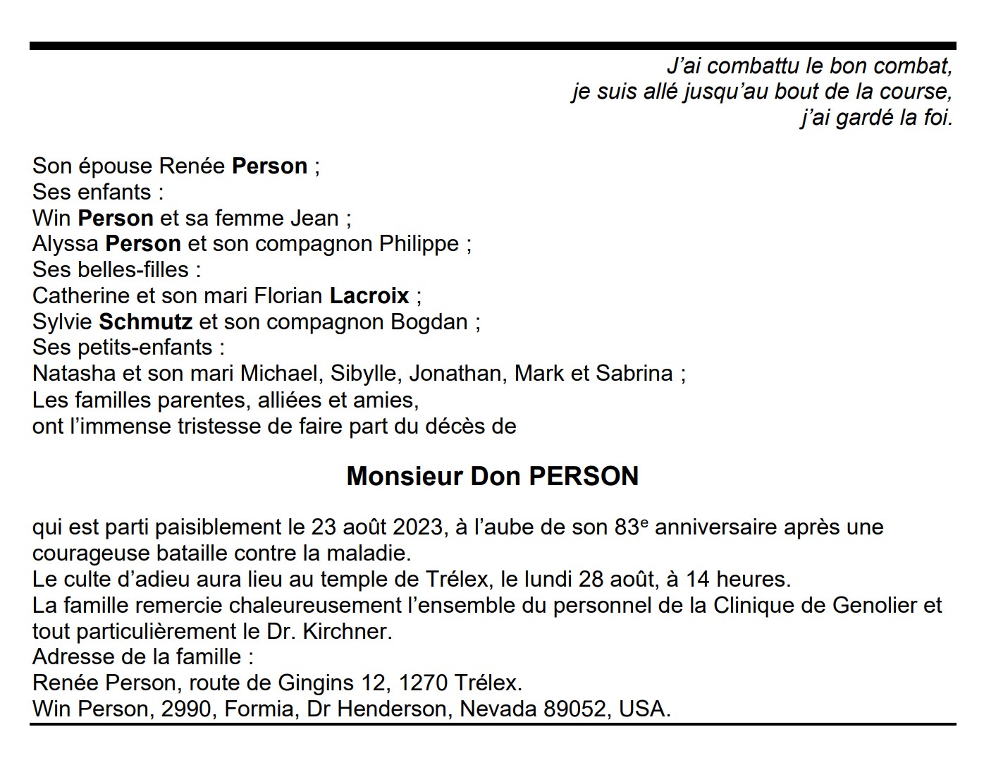 Monsieur Don PERSON 08 sep. 1940 - 23 aoû. 2023 Avis mortuaire PFG Télecharger PDF Partager sur: Galerie PreviousNext PreviousNext