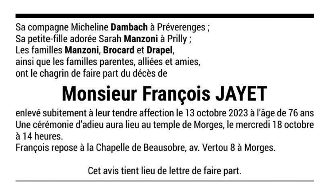 Monsieur François JAYET 28 mar. 1947 - 13 oct. 2023 Avis mortuaire PFG Télecharger PDF Partager sur: Galerie PreviousNext PreviousNext