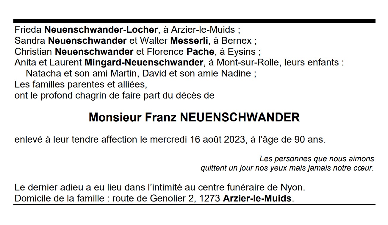 Monsieur Franz NEUENSCHWANDER 20 mar. 1933 - 16 aoû. 2023 Avis mortuaire PFG Télecharger PDF Partager sur: Galerie PreviousNext PreviousNext