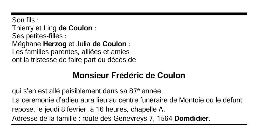 Monsieur Frédéric de Coulon 07 avr. 1937 Avis mortuaire PFG Télecharger PDF Partager sur: Galerie PreviousNext PreviousNext