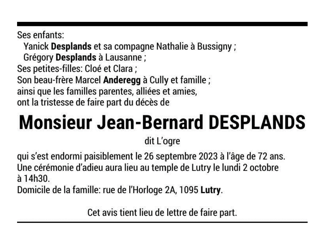 Monsieur Jean-Bernard DESPLANDS 26 sep. 2023 Avis mortuaire PFG Télecharger PDF Partager sur: Galerie PreviousNext PreviousNext