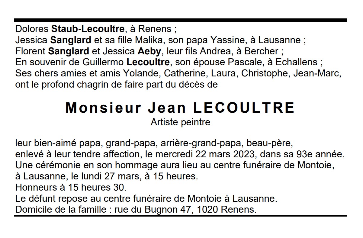 Monsieur Jean LECOULTRE 09 juin. 1930 - 22 mar. 2023 Avis mortuaire PFG Télecharger PDF Partager sur: Galerie PreviousNext PreviousNext