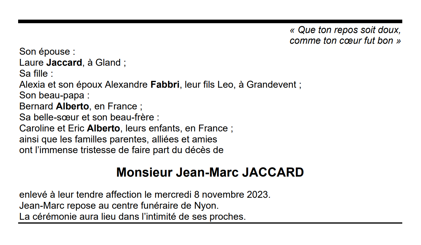 Monsieur Jean-Marc JACCARD 06 avr. 1959 - 08 nov. 2023 Avis mortuaire PFG Télecharger PDF Partager sur: Galerie PreviousNext PreviousNext