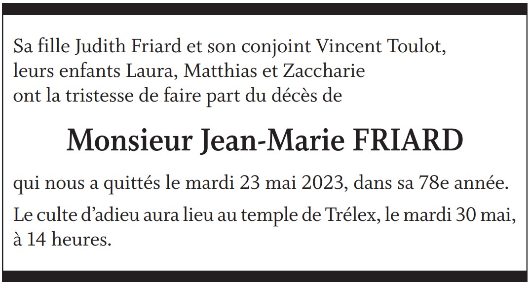 Monsieur Jean-Marie FRIARD 17 aoû. 1945 - 23 mai. 2023 Avis mortuaire PFG Télecharger PDF Partager sur: Galerie PreviousNext PreviousNext