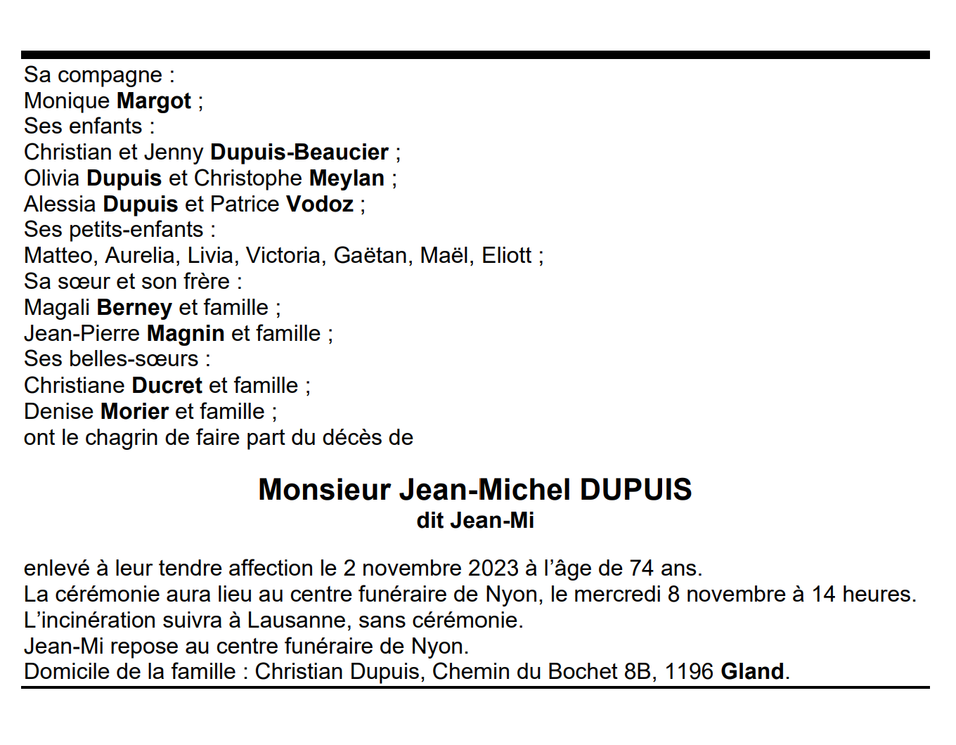 Monsieur Jean-Michel DUPUIS dit Jean-Mi 14 jan. 1949 - 02 nov. 2023 Avis mortuaire PFG Télecharger PDF Partager sur: Galerie PreviousNext PreviousNext