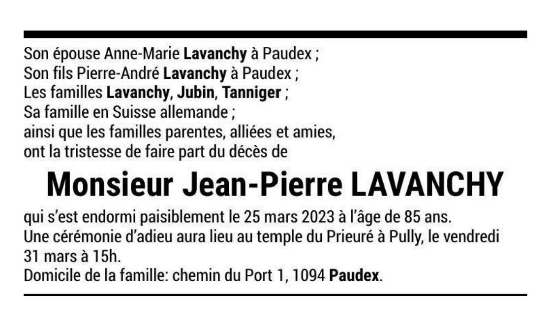 Monsieur Jean-Pierre LAVANCHY 16 sep. 1937 - 25 mar. 2023 Avis mortuaire PFG Télecharger PDF Partager sur: Galerie PreviousNext PreviousNext