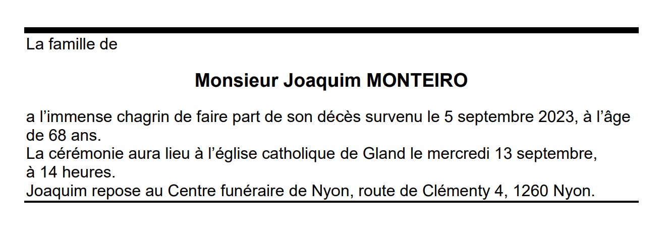 Monsieur Joaquim MONTEIRO 19 aoû. 1955 - 05 sep. 2023 Avis mortuaire PFG Télecharger PDF Partager sur: Galerie PreviousNext PreviousNext