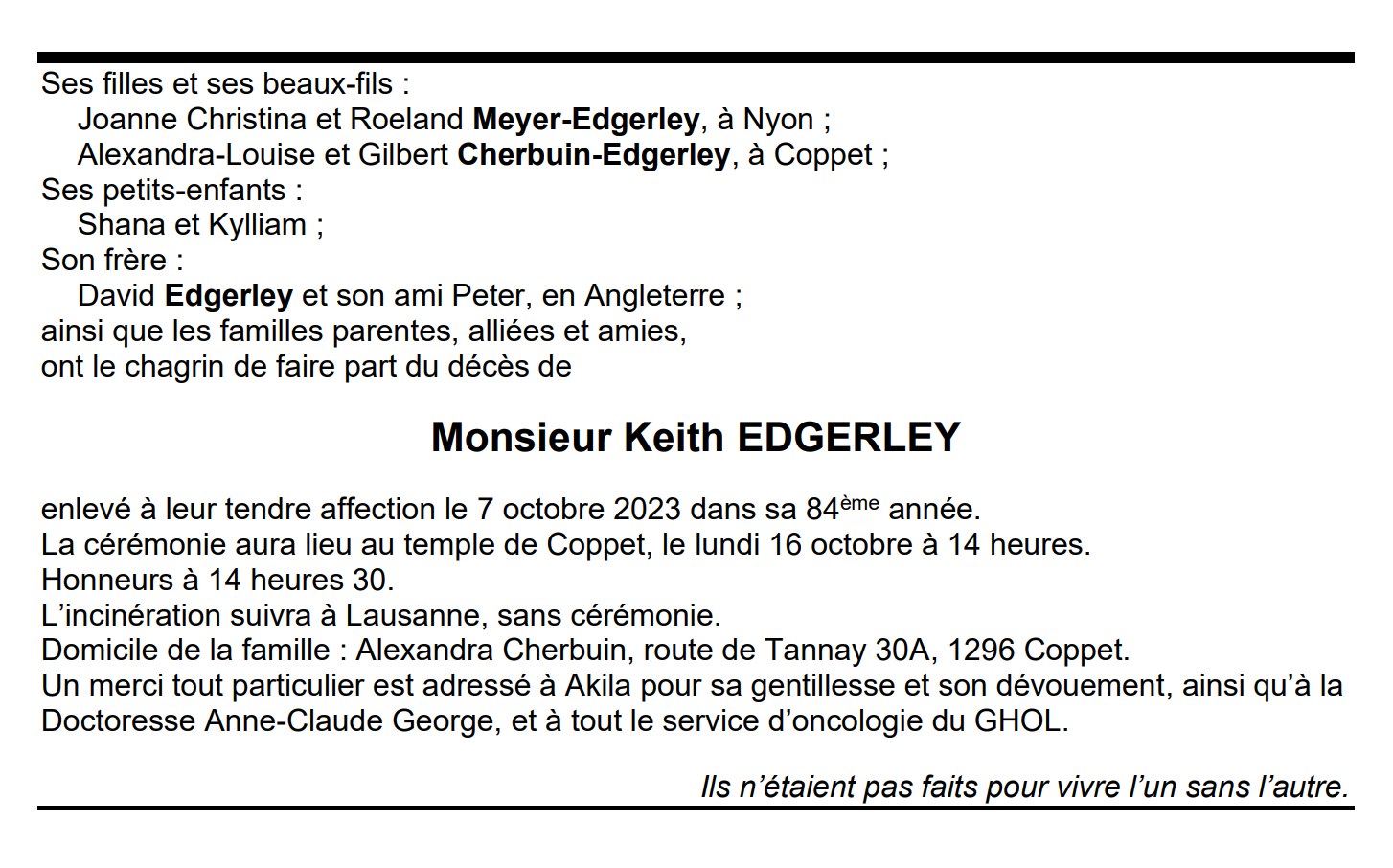 Monsieur Keith EDGERLEY 07 déc. 1939 - 07 oct. 2023 Avis mortuaire PFG Télecharger PDF Partager sur: Galerie