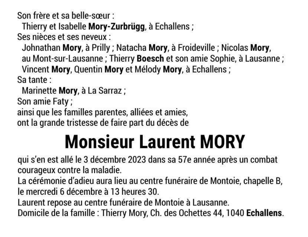 Monsieur Laurent MORY 29 juil. 1967 - 03 déc. 2023 Avis mortuaire PFG Télecharger PDF Partager sur: Galerie PreviousNext PreviousNext