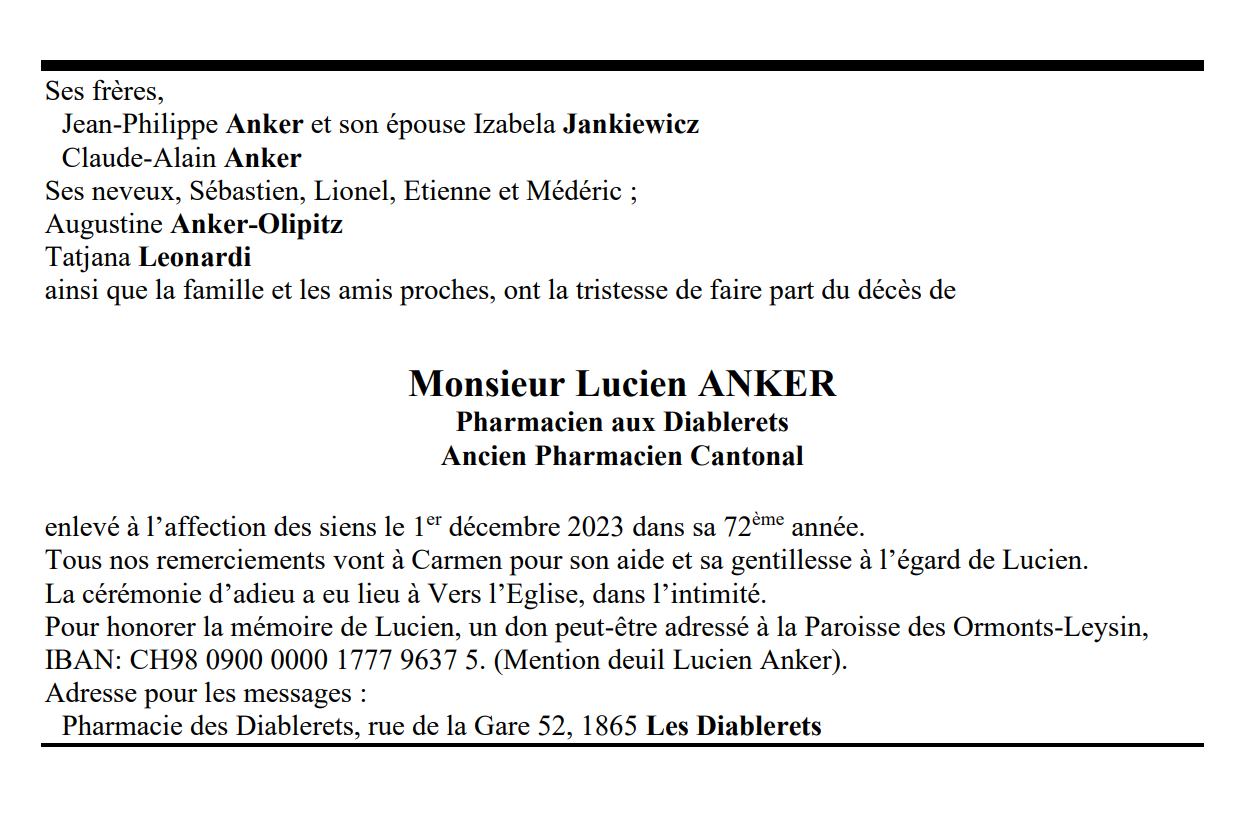 Monsieur Lucien ANKER 31 mai. 1952 - 01 déc. 2023 Avis mortuaire PFG Télecharger PDF Partager sur: Galerie PreviousNext PreviousNext