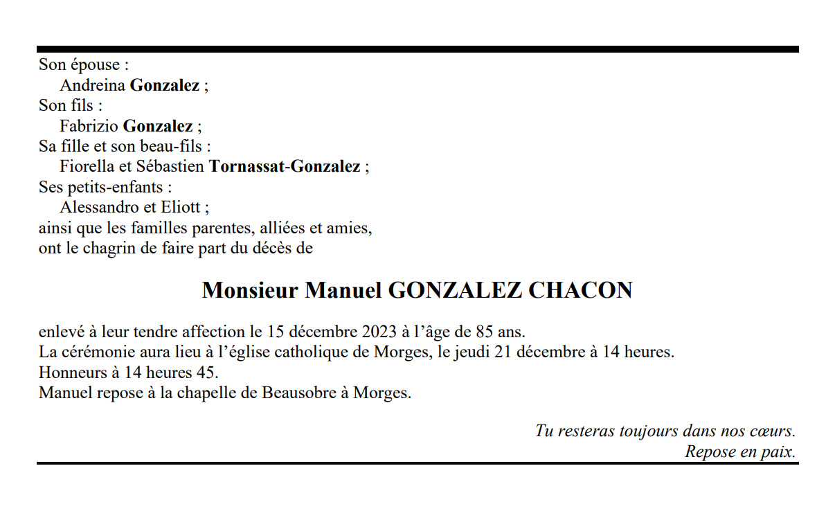 Monsieur Manuel GONZALEZ CHACON 14 mar. 1938 - 15 déc. 2023 Avis mortuaire PFG Télecharger PDF Partager sur: Galerie PreviousNext PreviousNext