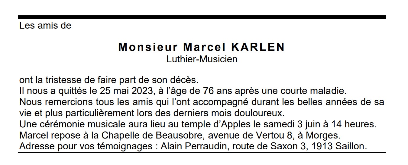 Monsieur Marcel KARLEN Luthier-Musicien 10 mai. 1947 - 25 mai. 2023 Avis mortuaire PFG Télecharger PDF Partager sur: Galerie PreviousNext PreviousNext