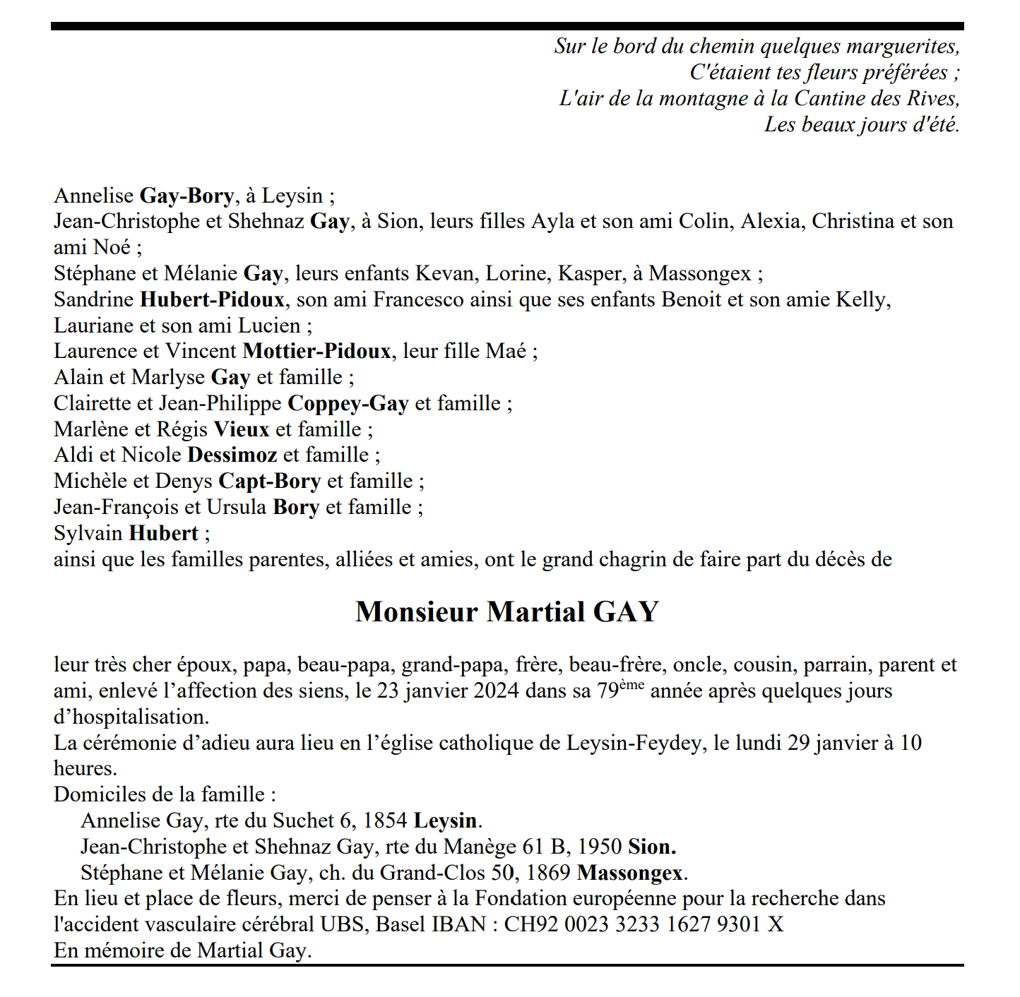Monsieur Martial GAY 23 juin. 1945 - 23 jan. 2024 Avis mortuaire PFG Télecharger PDF Partager sur: Galerie PreviousNext PreviousNext