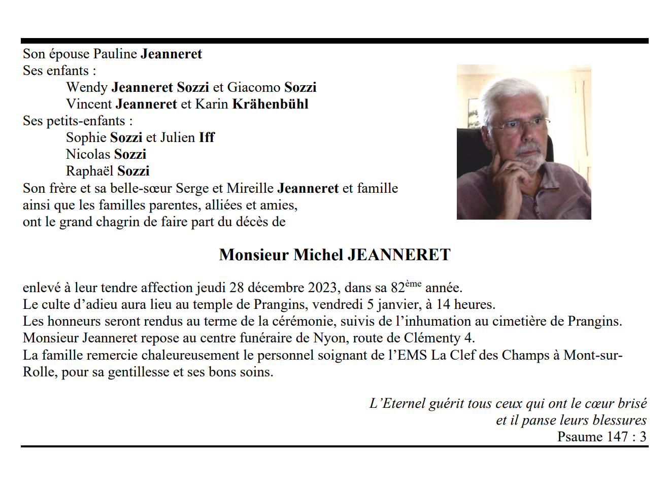 Monsieur Michel JEANNERET 03 mai. 1942 - 28 déc. 2023 Avis mortuaire PFG Télecharger PDF Partager sur: Galerie PreviousNext PreviousNext