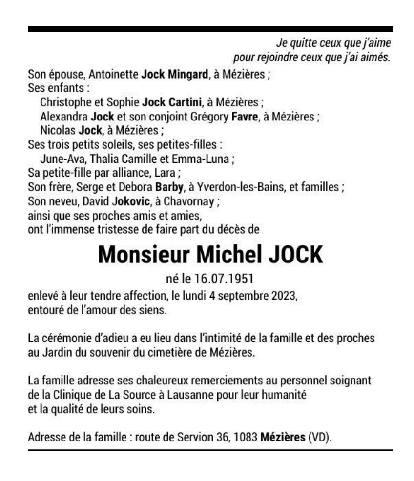 Monsieur Michel JOCK 16 juil. 1951 - 04 sep. 2023 Avis mortuaire PFG Télecharger PDF Partager sur: Galerie PreviousNext PreviousNext