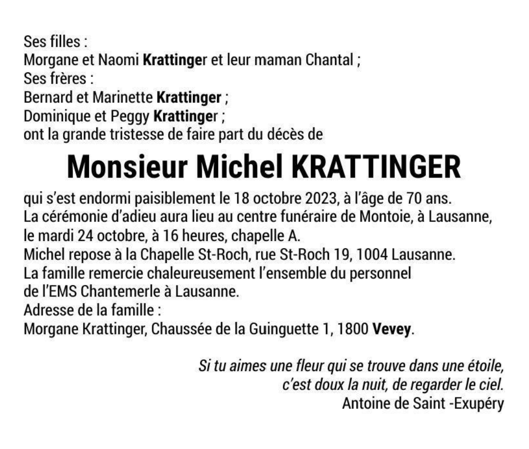 Monsieur Michel KRATTINGER 01 avr. 1953 - 18 oct. 2023 Avis mortuaire PFG Télecharger PDF Partager sur: Galerie PreviousNext PreviousNext