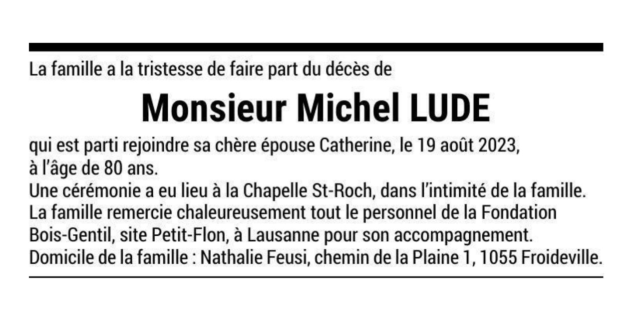 Monsieur Michel LUDE 06 fév. 1943 - 19 aoû. 2023 Avis mortuaire PFG Télecharger PDF Partager sur: Galerie PreviousNext PreviousNext