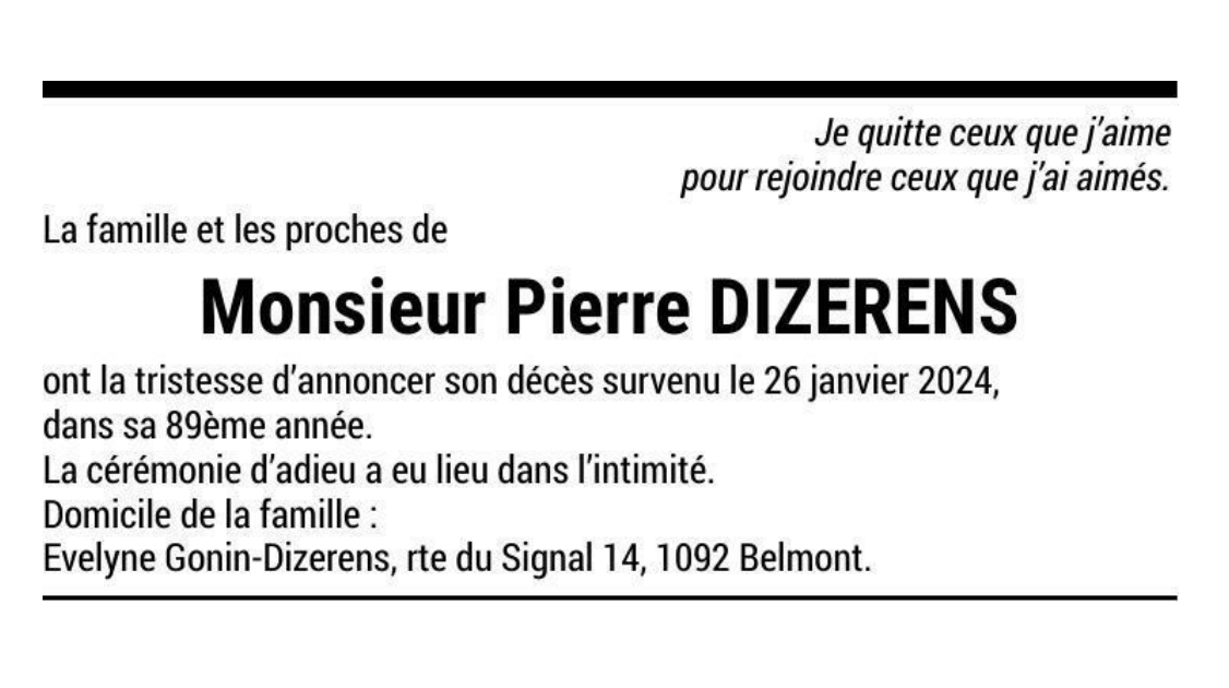 Monsieur Pierre DIZERENS 18 oct. 1935 - 26 jan. 2024 Avis mortuaire PFG Télecharger PDF Partager sur: Galerie PreviousNext PreviousNext