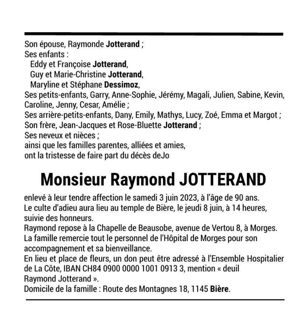 Monsieur Raymond JOTTERAND 05 mai. 1933 - 03 juin. 2023 Avis mortuaire PFG Télecharger PDF Partager sur: Galerie PreviousNext PreviousNext