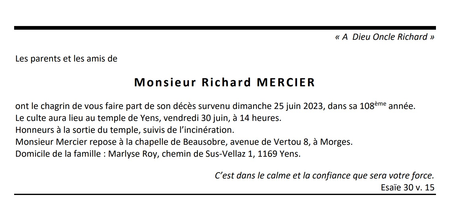 Monsieur Richard MERCIER 28 jan. 1916 - 25 juin. 2023 Avis mortuaire PFG Télecharger PDF Partager sur: Galerie PreviousNext PreviousNext
