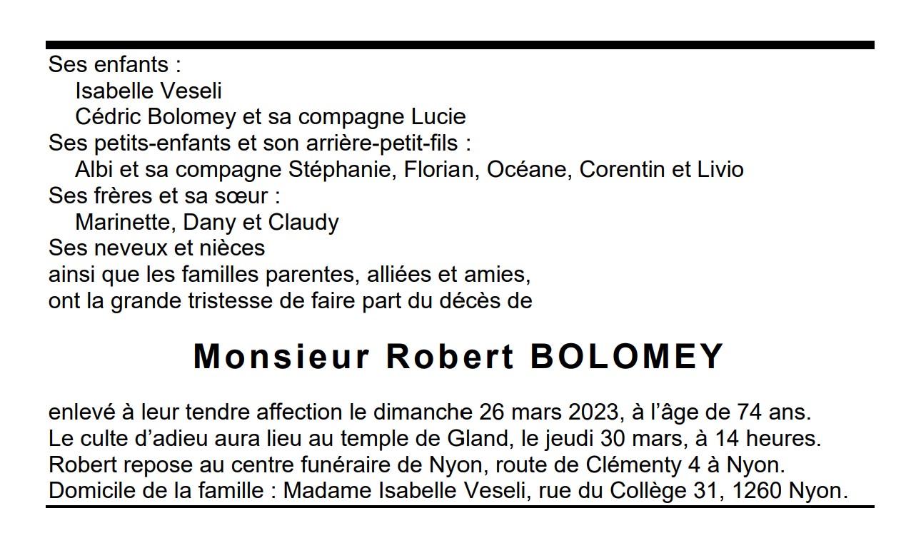 Monsieur Robert BOLOMEY 19 oct. 1935 - 24 mar. 2023 Avis mortuaire PFG Télecharger PDF Partager sur: Galerie PreviousNext PreviousNext