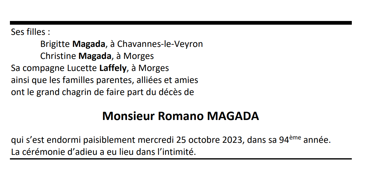 Monsieur Romano MAGADA 11 fév. 1930 - 25 oct. 2023 Avis mortuaire PFG Télecharger PDF Partager sur: Galerie PreviousNext PreviousNext