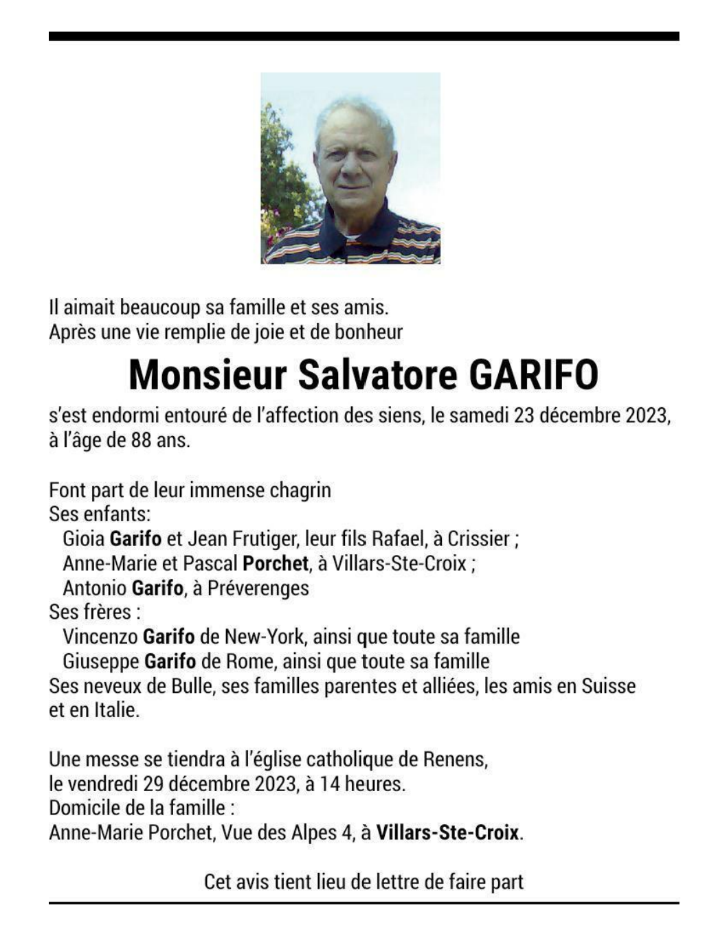 Monsieur Salvatore GARIFO 28 aoû. 1935 - 23 déc. 2023 Avis mortuaire PFG Télecharger PDF Partager sur: Galerie PreviousNext PreviousNext