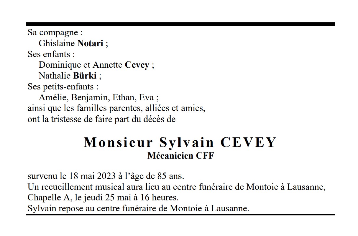Monsieur Sylvain CEVEY Mécanicien CFF 01 mai. 1938 - 18 mai. 2023 Avis mortuaire PFG Télecharger PDF Partager sur: Galerie PreviousNext PreviousNext
