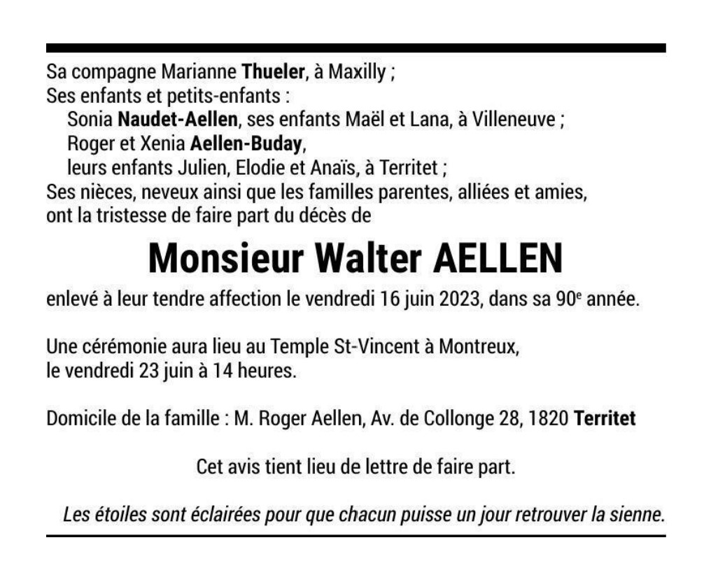 Monsieur Walter AELLEN 17 nov. 1933 - 16 juin. 2023 Avis mortuaire PFG Télecharger PDF Partager sur: Galerie PreviousNext PreviousNext