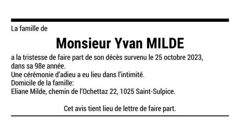 Monsieur Yvan MILDE 24 nov. 1925 - 25 oct. 2023 Avis mortuaire PFG Télecharger PDF Partager sur: Galerie PreviousNext PreviousNext
