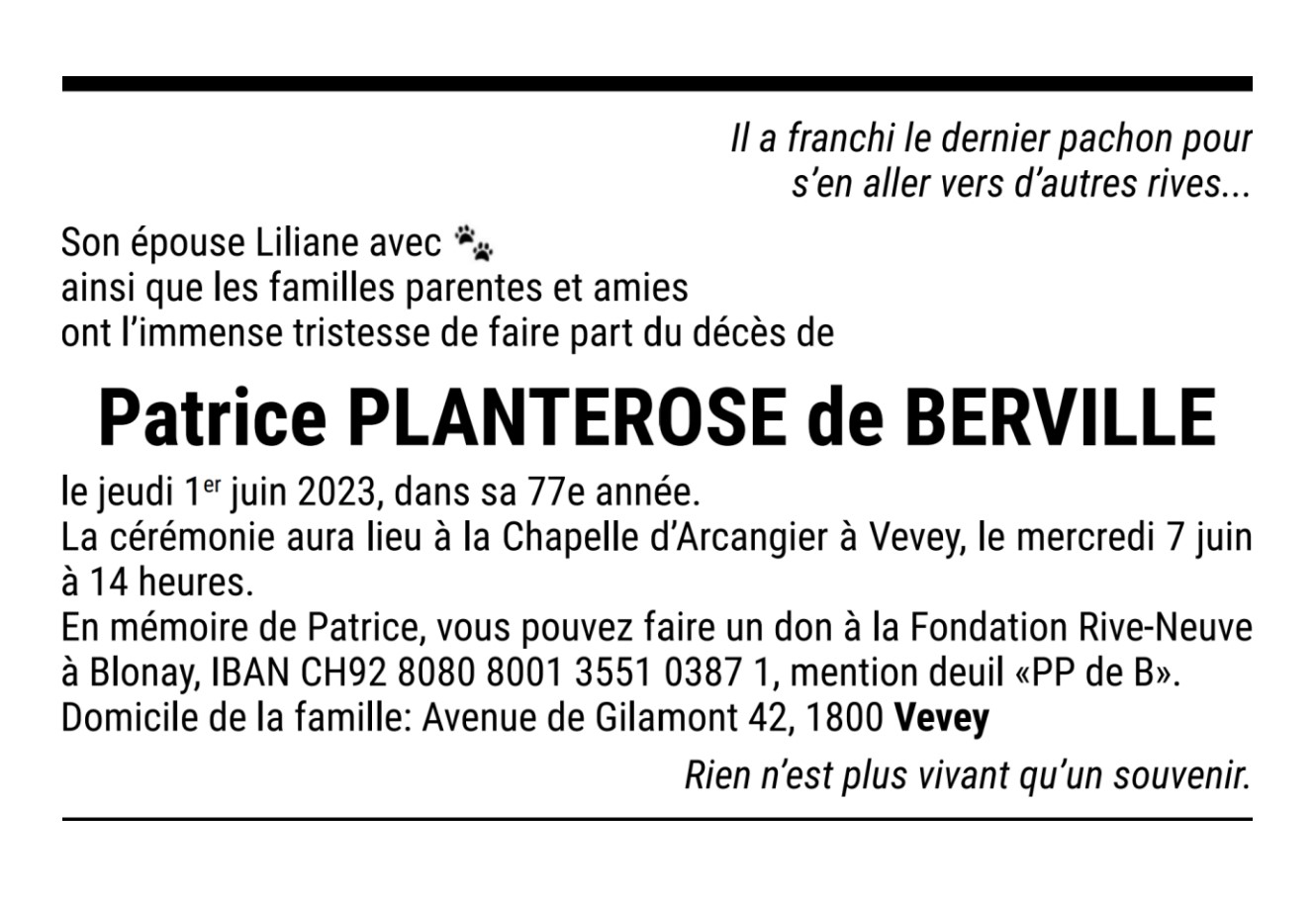 Patrice PLANTEROSE de BERVILLE 07 oct. 1946 - 01 juin. 2023 Avis mortuaire PFG Télecharger PDF Partager sur: Galerie PreviousNext PreviousNext