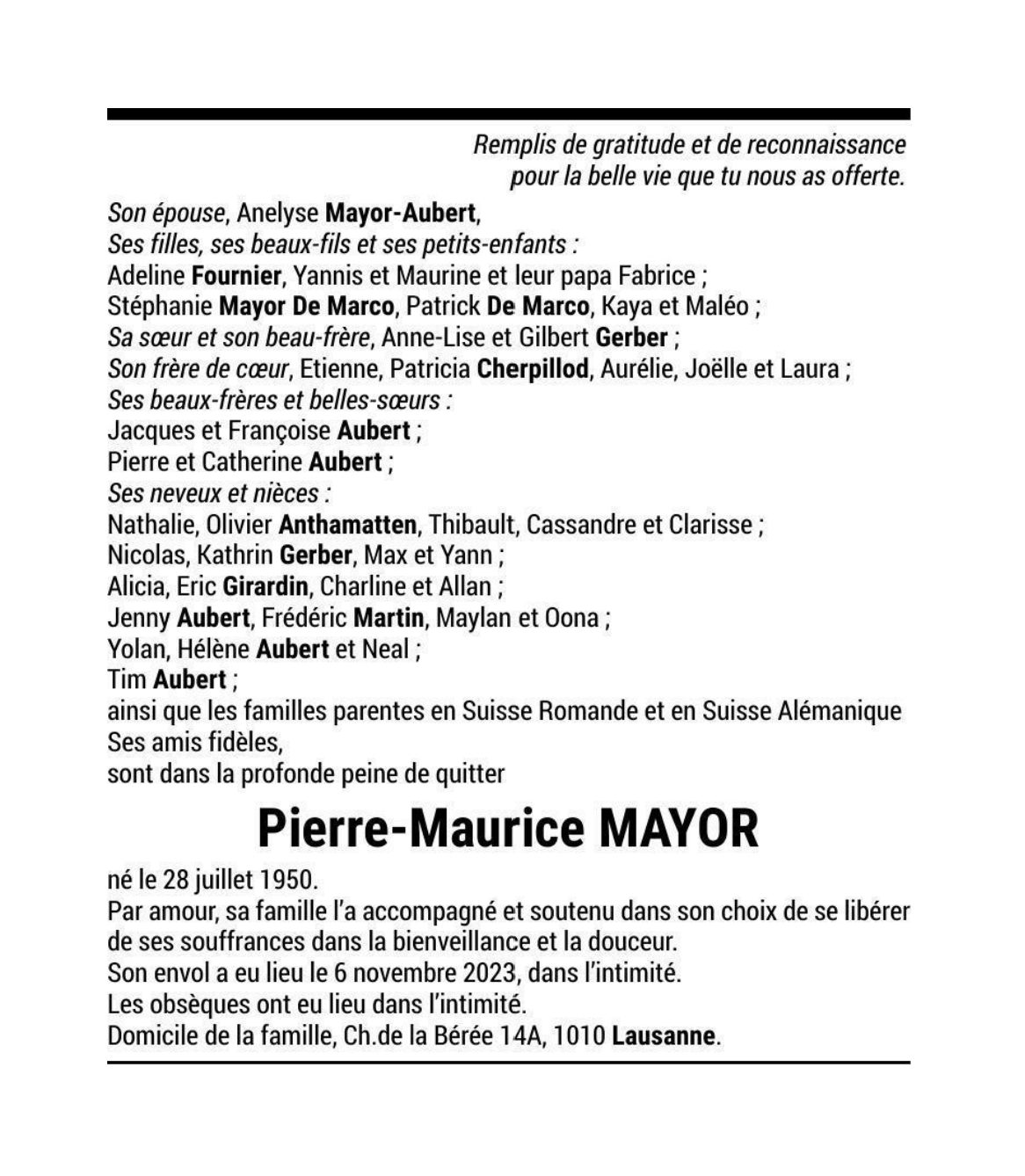 Pierre-Maurice MAYOR 28 juil. 1950 - 06 nov. 2023 Avis mortuaire PFG Télecharger PDF Partager sur: Galerie PreviousNext PreviousNext