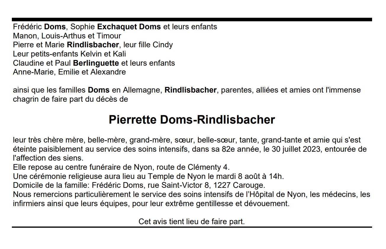 Pierrette Doms-Rindlisbacher 04 déc. 1941 - 30 juil. 2023 Avis mortuaire PFG Télecharger PDF Partager sur: Galerie PreviousNext PreviousNext