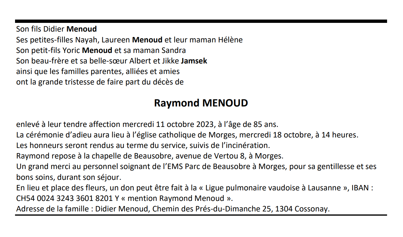 Raymond MENOUD 18 jan. 1938 - 11 oct. 2023 Avis mortuaire PFG Télecharger PDF Partager sur: Galerie PreviousNext PreviousNext