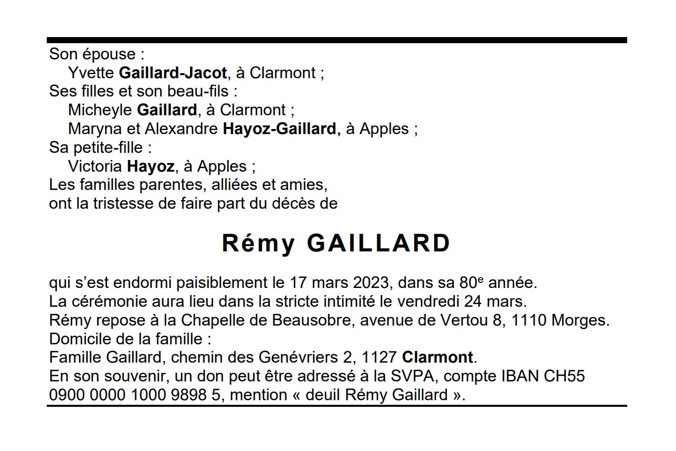 Rémy GAILLARD 28 sep. 1943 - 17 mar. 2023 Avis mortuaire PFG Télecharger PDF Partager sur: Galerie PreviousNext PreviousNext