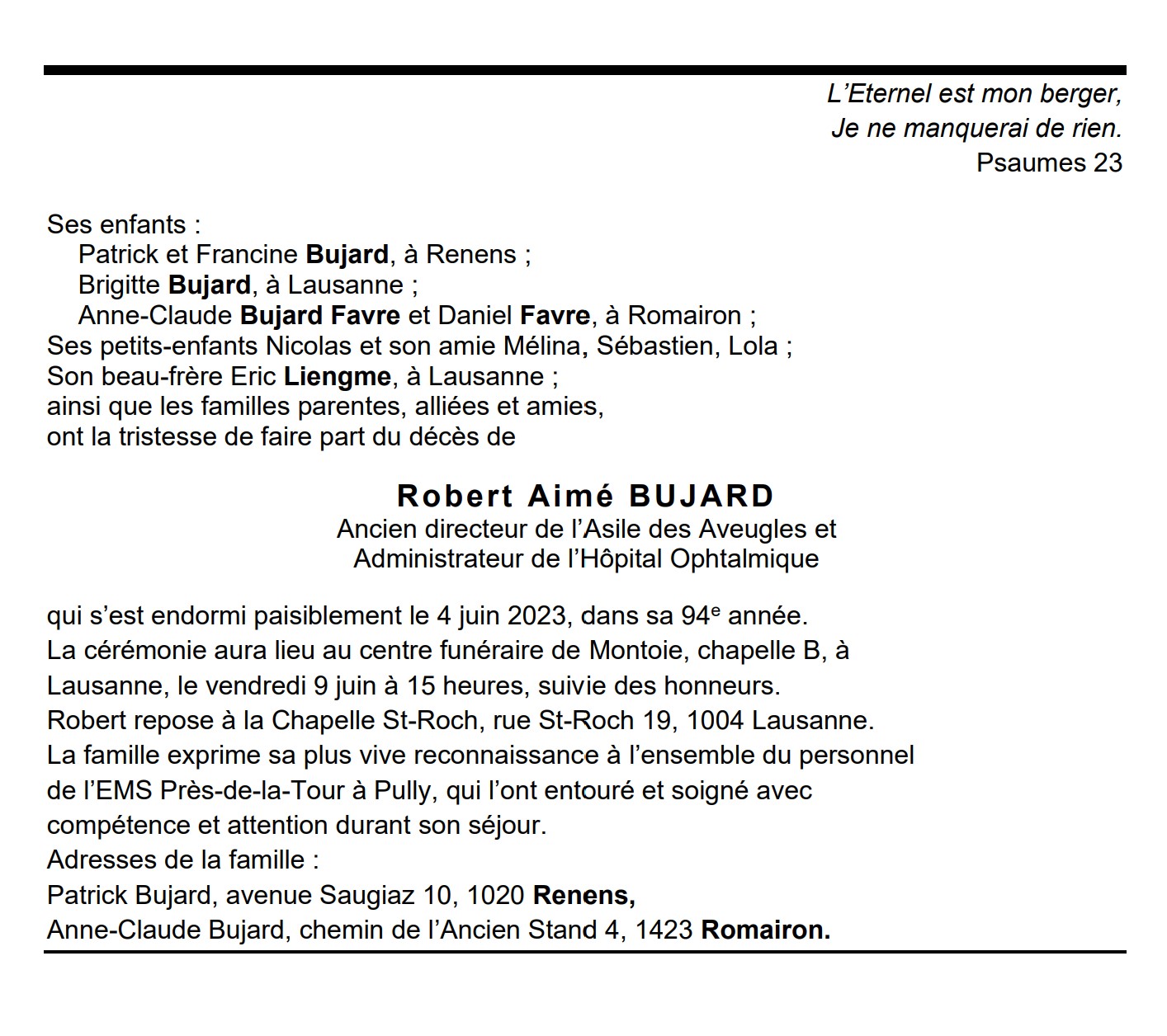 Robert Aimé BUJARD Ancien directeur de l’Asile des Aveugles et Administrateur de l’Hôpital Ophtalmique 27 nov. 1929 - 04 juin. 2023 Avis mortuaire PFG Télecharger PDF Partager sur: Galerie PreviousNext PreviousNext