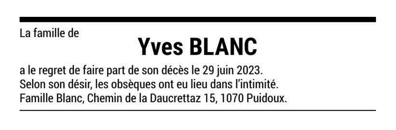 Yves BLANC 14 jan. 1954 - 29 juin. 2023 Avis mortuaire PFG Télecharger PDF Partager sur: Galerie PreviousNext PreviousNext