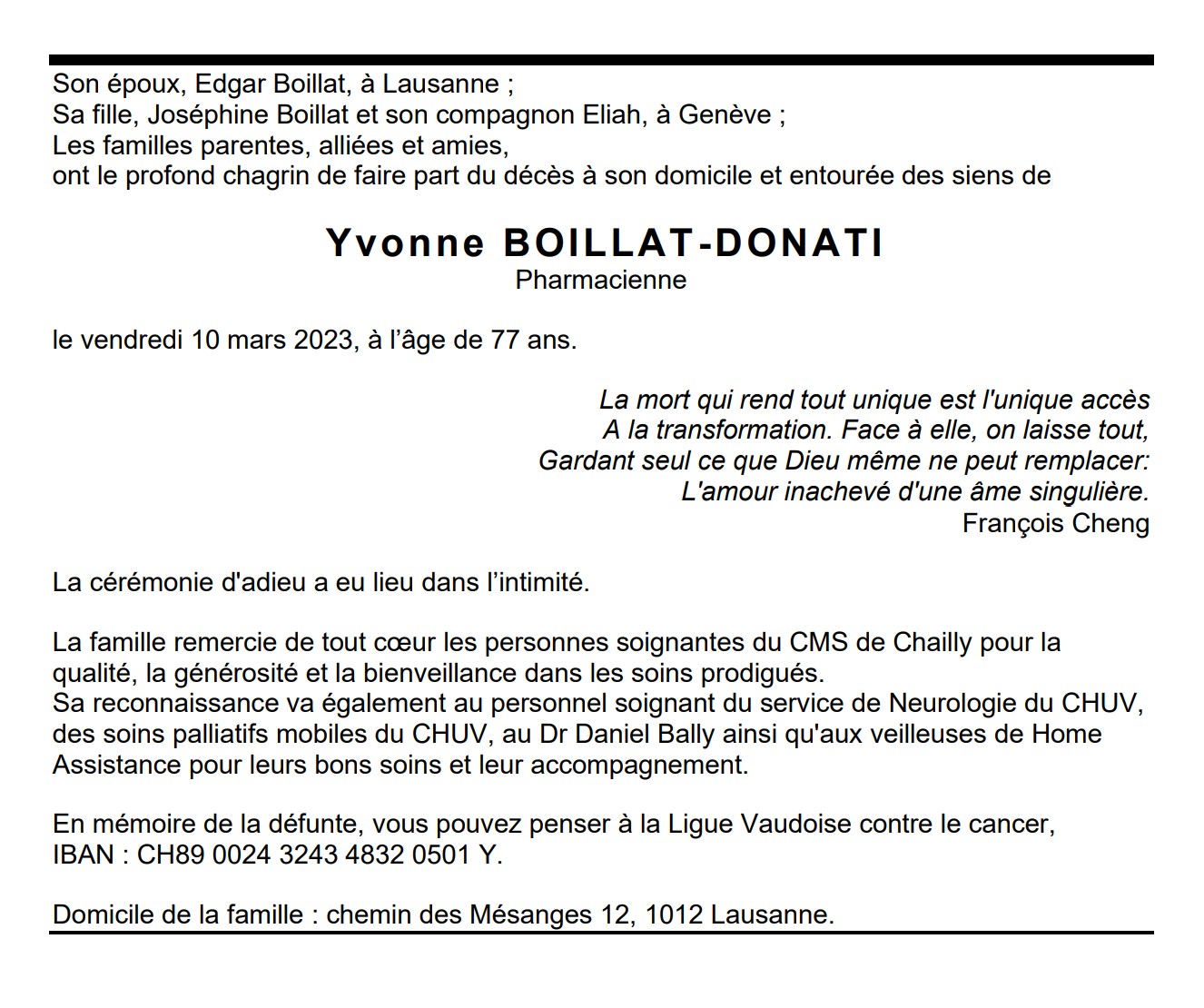 Yvonne BOILLAT-DONATI 20 avr. 1945 - 10 mar. 2023 Avis mortuaire PFG Télecharger PDF Partager sur: Galerie PreviousNext PreviousNext